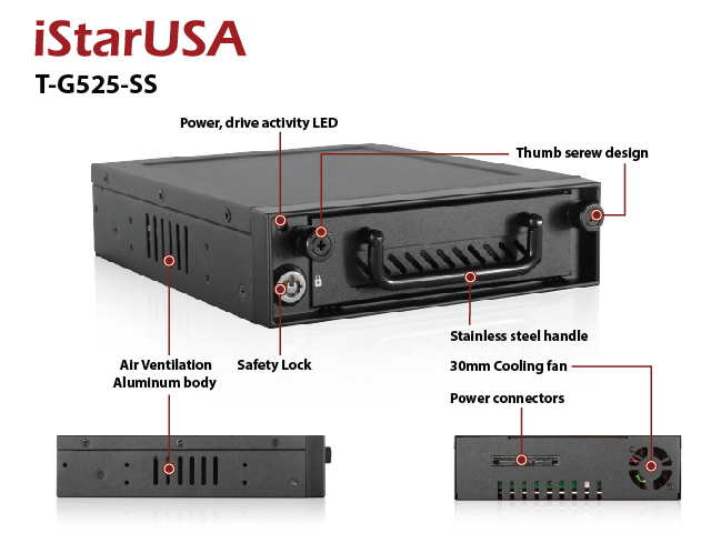 Industrial design iStarUSA T-G525-SS hotswap hard drive cage. With unique screwless HDD mounting patented design, high performance SAS/SATA 6.0Gb/s interface, and easy swap tray design, T-G525-SS is tough in strength but flexible in functionality. By popular demand, the LED display light features blue